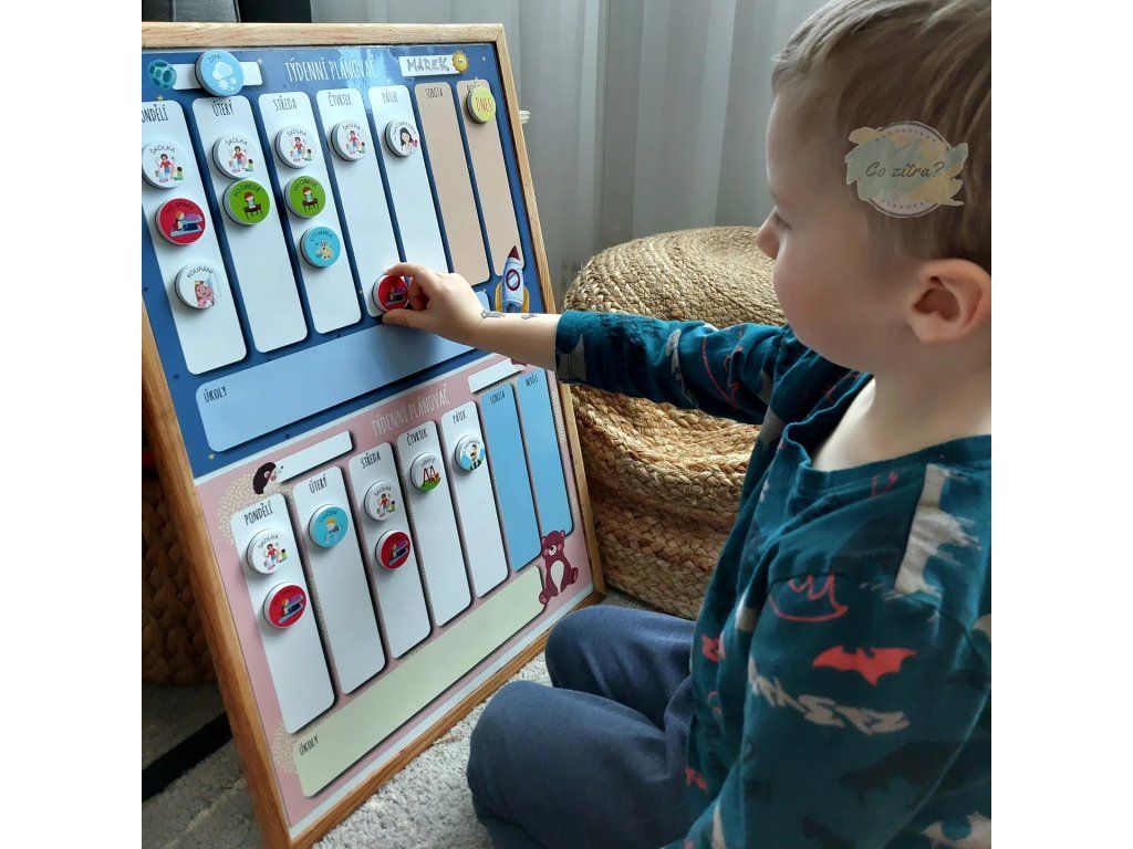 Magnetický plánovač pro předškoláky nebo školáky. Je vyroben z tvrdé PVC magnetické fólie tl. 0,5mm a rozměru 364mm x 264mm. Plánovač je popisovatelný a lze umístit na ledničku nebo jiný magnetický povrch. Pokud doma žádný povrch nemáte, lze si dokoupit Nástěnku s rámečkem, na kterou lze plánovač umístit a pak zavěsit kamkoli na stěnu. Nástěnky s rámečkem máme v nabídce také.